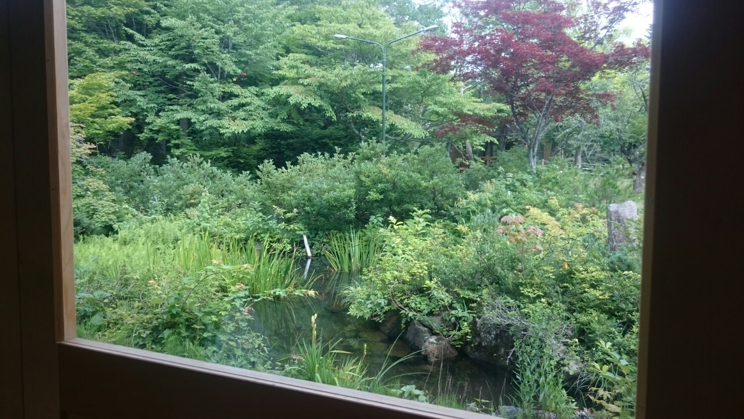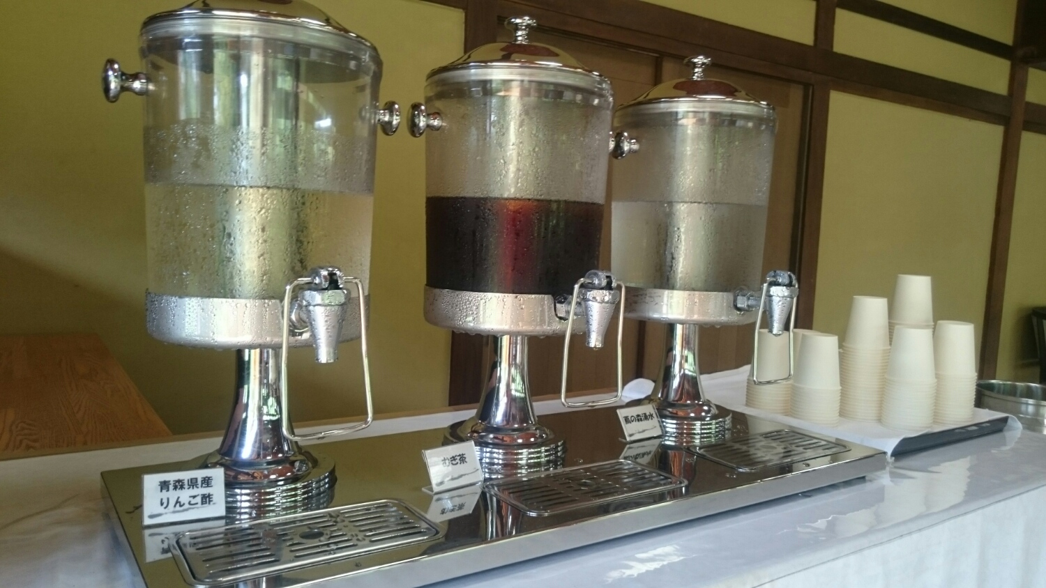 避暑地にて、風呂あがりに緑を観賞しながら、リンゴ酢を~