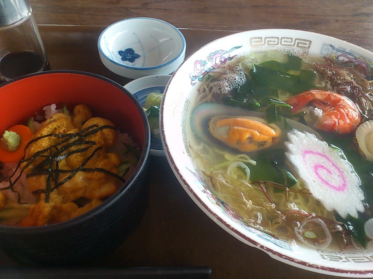 ミニ生ウニ丼と、海鮮ラーメン。