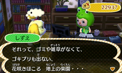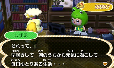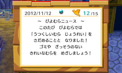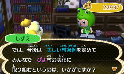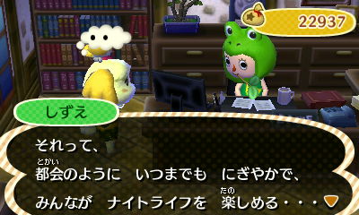 村のみんなを朝型にします。お店の開店時間や住民の起床時間が早くなる効果があります。早い時間にプレイすることが多い方にオススメ。