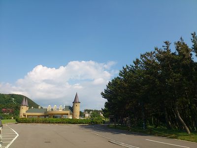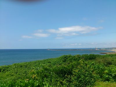 青い空、白い雲、青い海、緑の草っぱら。