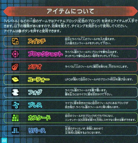 カスケード…自分のフィールドのブロックがバラバラになり、3DS本体を傾けた方向にスキマなく寄せることができます。