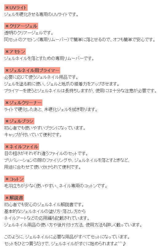 商品の仕様をみると、このセットがあれば今すぐジェルネイルが楽しめるらしいんだ。