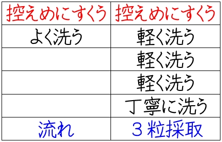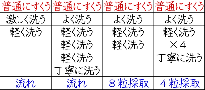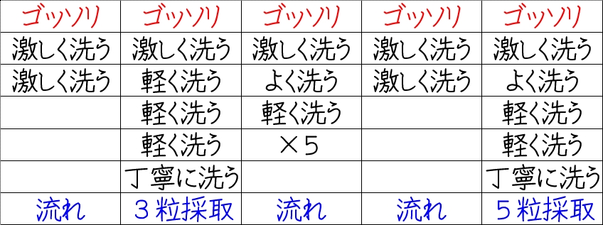 ゴシゴシ洗うのか、やさしく洗うのかで砂礫の取れ方が違います。