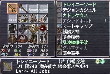 トレイニーソード ●● (片手剣) D1 隔240 潜在能力:錬金術スキル+1 Lv1~ All Jobs
